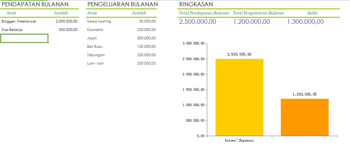Di bawah ini saya sertakan ilustrasi sederhana pendapatan vs pengeluaran ala saya sebagai ibu rumah tangga dan freelancer :