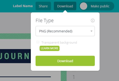 6. Setelah file di beri nama, baru kita download supaya nanti bisa di print. Ada beberapa pilihan download file yaitu PNG, JPG, PDF. Karena labelnya nanti akan di print, simpan dalam bentuk PDF saja ya.