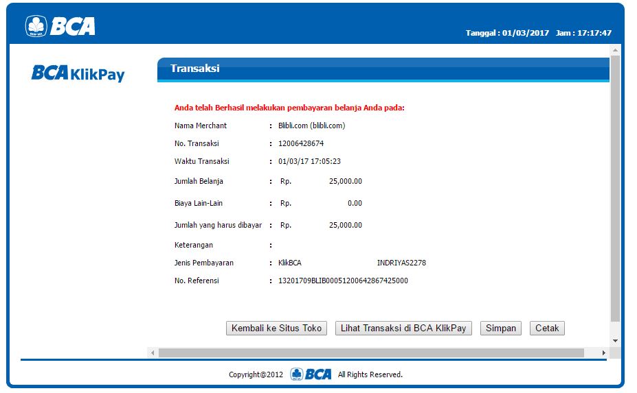 Saya memilih pulsa telpon, isikan nominal pulsa dan nomor handphone. Setelah selesai klik bayar. Pembayaran bisa di lakukan menggunakan kartu kredit atau klikpay. Karena saya pengguna klikbca, saya memilih pembayaran menggunakan klikpay.